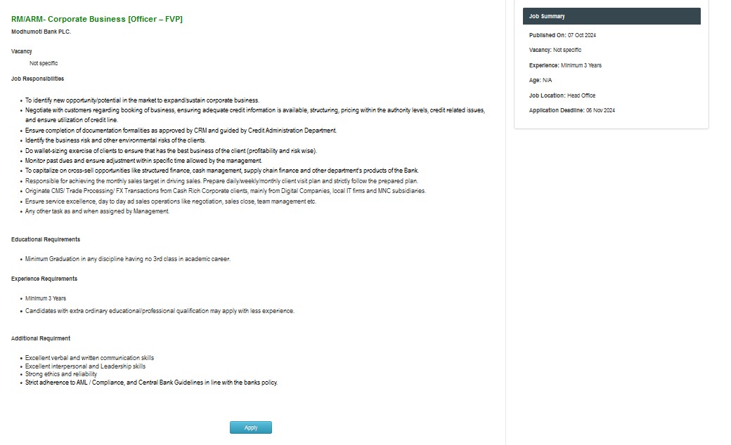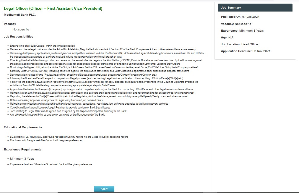 We have given the application link website for all the manpower of Bangladesh. You can finish the activities by knowing the rules and regulations. Don’t miss the opportunity because it is very good news that Modhumoti Bank, which is struggling to get a job in any bank, has filled more posts.