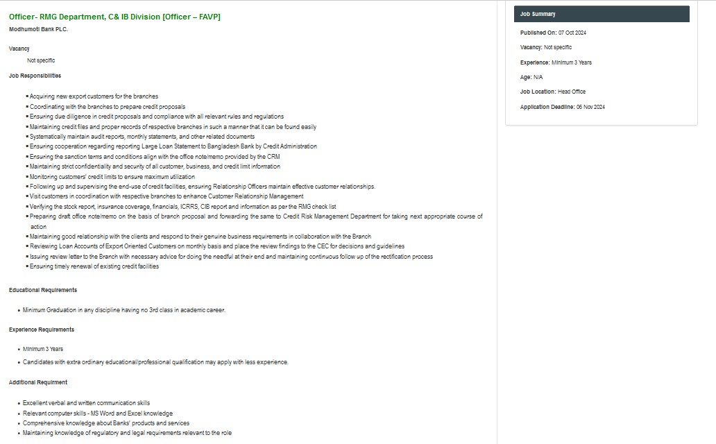 Get a job in a bank Increase the bright success of your career because Modhumoti Bank Limited offers huge opportunities to work permanently. They are established at the top as compared to other banks. There is no doubt that there are more officers and they get better salaries. If you want to know more about Modhumoti Bank Ltd. then visit their official website now and see different then all the subject matter will be cleared. See the bank recruitment circular given below.