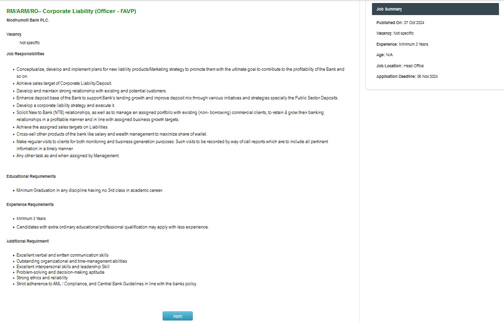 New recruitment notice has been published in Modhumoti Bank Limited. Circular can be found here. The final policy is to verify the citizens who are willing to apply for this job and then apply online if you are a qualified person. Modhumoti Bank Limited has recruited manpower in compliance with all the rules and regulations. If you like this new recruitment in 2024, you can be interested for the next jobs.